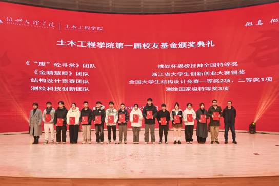 2025年12月3日晚,土木工程学院“筑梦·启航”第一届校友基金颁奖典礼暨迎新晚会在风则江大讲堂隆重举行。校友出资企业代表——浙江筑脸全过程工程咨询公司董事长阮木、浙江中祺建设有限公司董事长应雄、长业建设集团有限公司党委副书记丁建浩、浙江亿厦建设集团股份有限公司董事夏文君、浙江中柱建设有限公司常务副总经理王善忠等杰出校友,与土木工程学院党委书记袁油迪,副院长梁超锋、黄睿,党委副书记、纪委书记沙鹏,党委副书记方刘基等学院领导,以及学院学生科全体辅导员、2025级全体新生和其他师生代表欢聚一堂,共襄盛举。