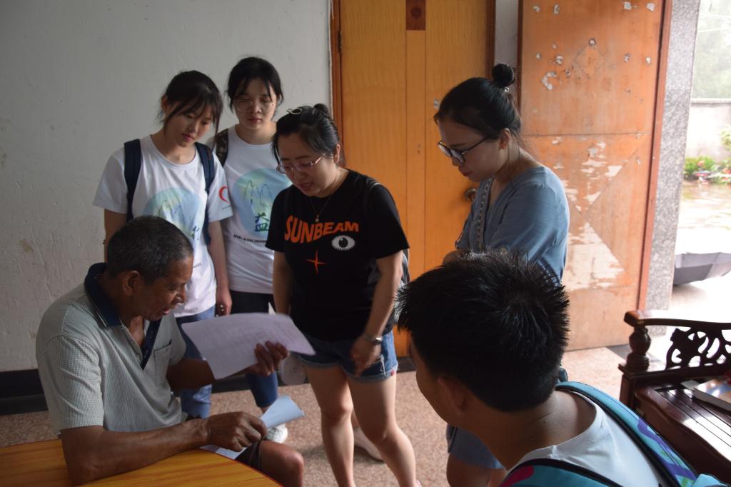 随后,小组分别对村民、村委进行关于地质灾害问题的问卷调查。村里有很多老年人,虽然语言交流有些障碍,但都很热情耐心的听着同学们讲解和做问卷。其中有一位老爷爷今年已经九十高龄了,访谈过程中得知他还是一位老党员,他很支持此次同学们开展的地质灾害防治主题调研,寄语同学们要把实践落到实处,发挥实效。