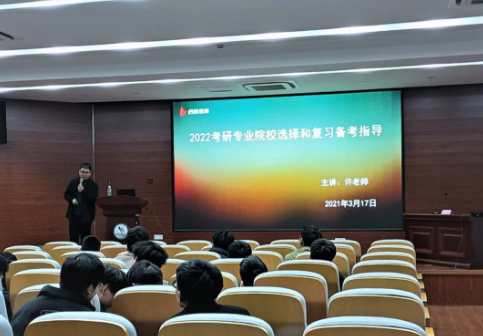 首先,学院党委副书记王东亮老师分析了我院前几年的考研形势,指出我院的考研率即使在逐年增长,但总体并不高,其中主要问题是大部分学生对考研不重视或是对考研有想法却无法坚持。随后,王老师以自身先投入工作,后考研的经历为例,讲述考研对大学生未来发展的重要性,坚定了我们考研的决心,鼓励我们积极准备考研。