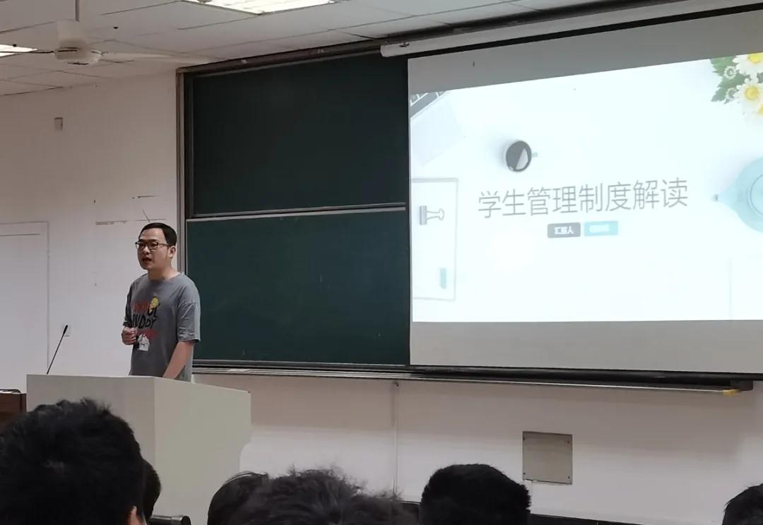 何泽楠老师从学籍管理、日常管理、纪律处分等方面介绍我院学生管理制度,把学生手册中的重要内容进行了一一解读。