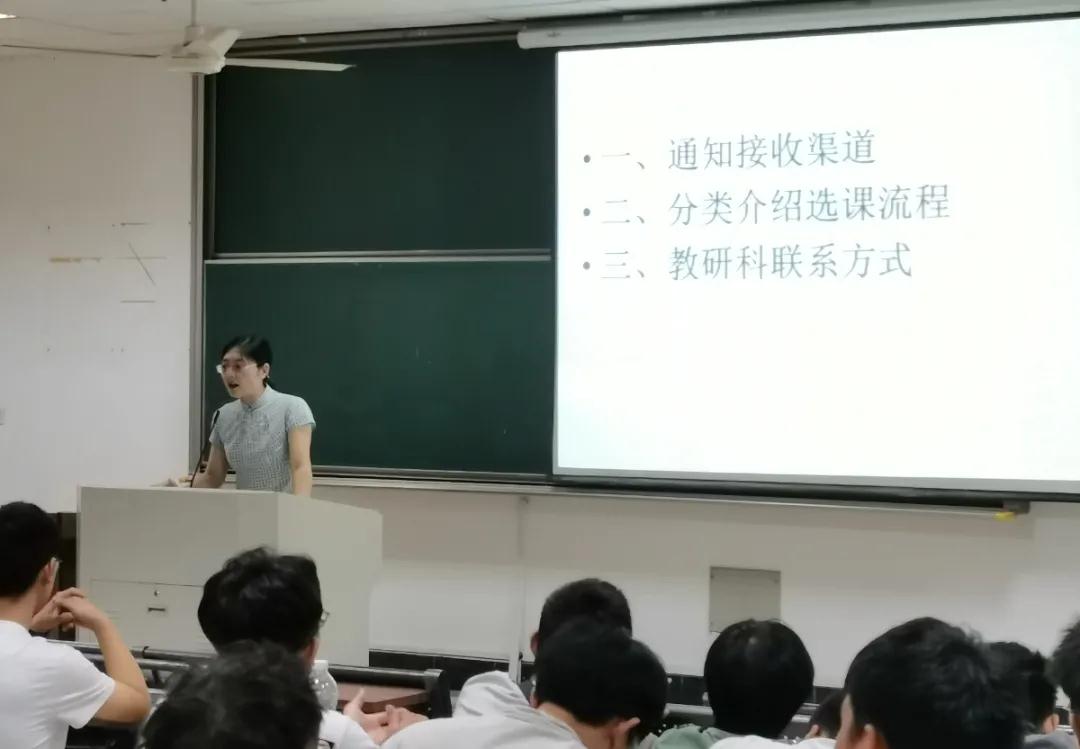 李琳老师帮助新生进行选课管理相关制度解读,从通知接收渠道、分类介绍选课流程和教研科联系方式三个方面,帮助新生了解选课流程。