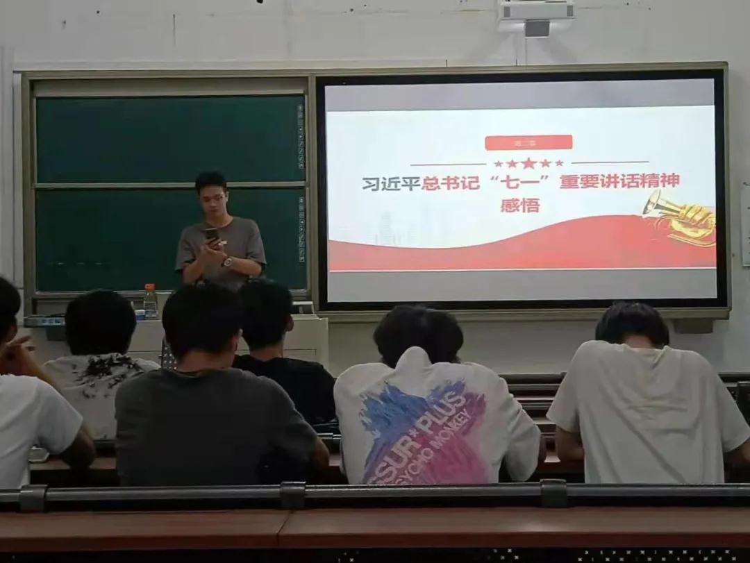 而后,团支书向大家展示了习近平主席在庆祝中国共产党成立100周年大会上的重要讲话和进一步向我们解析了习近平总书记的“七一”重要讲话,在大会上,习近平主席帮我们回顾了中国共产党百年奋斗的光辉历程,展望了中华民族伟大复兴的光明前景和正式宣布了我们国家已经实现了第一个百年奋斗目标,这代表了老百姓们已经走出了绝对贫穷,也标志了我们可以向第二个百年奋斗目标迈进了!学习完习近平总书记的讲话的重要精神后,班级许多同学都有一定的感悟,巴楯同学、贵俊杰同学、李永杰同学这三位同学也积极地上台分享了自己的感悟。