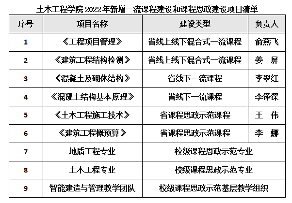 【教学改革】我院新增多项一流课程建设和课程思政建设项目 近日,省教育厅公布了2022年省级一流本科课程认定结果和省级课程思政教学项目建设立项名单,学校公布了2022年度课程思政示范项目立项结果。我院两门课程获省级课程思政示范课立项,4门课程获省级一流课程认定,两个专业获校级校课程思政示范专业立项,1个基层教学组织获示范基层教学组织立项。 土木工程学院2022年新增一流课程建设和课程思政建设项目清单序号项目名称...